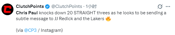 保罗训练动态引热议,湖人媒体表示,保罗想要湖人签下他;美媒Clutch Points则表示:保罗连续投进20个三分球,似乎是在向JJ-雷迪克和湖人队发出某种暗示。