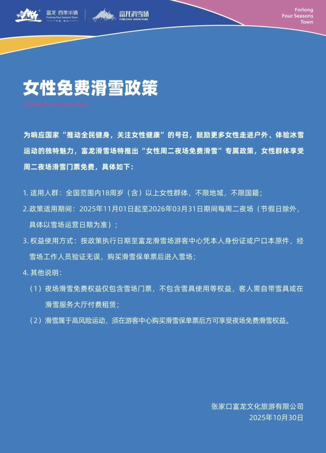 更绝的是,富龙滑雪场还针对女性客群做了一系列的“关照”措施,比如周二夜场对女生免费、设立专门的女性更衣室等等,让她们在这里玩儿的更尽兴。