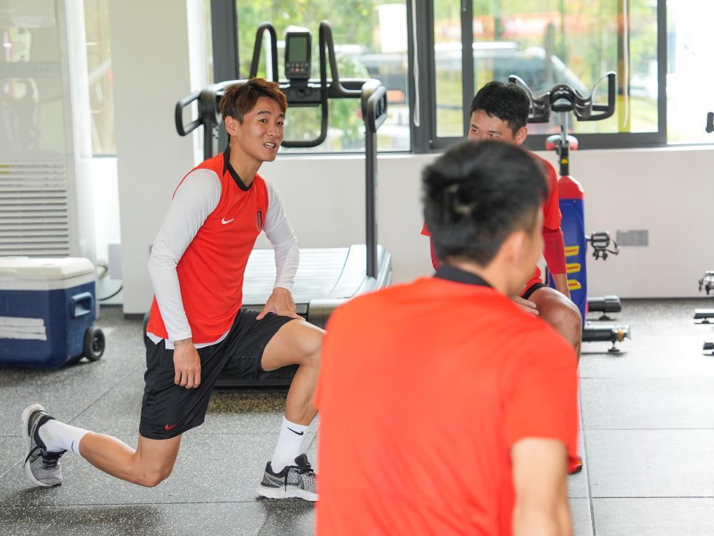 9月8日,成都蓉城队球员杨明洋(右一)在训练间隙。新华社记者 王曦 摄