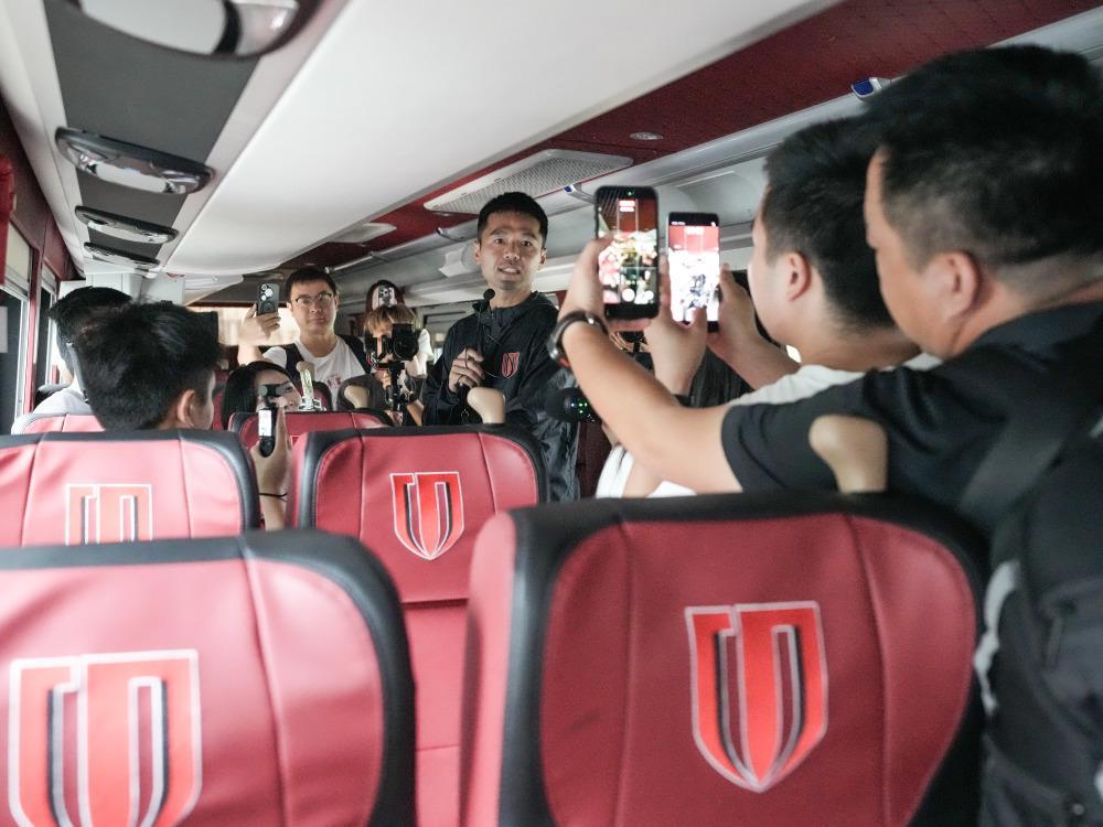 9月8日,成都蓉城队助理教练甘锐(右三)向记者介绍球队大巴情况。新华社记者 王曦 摄